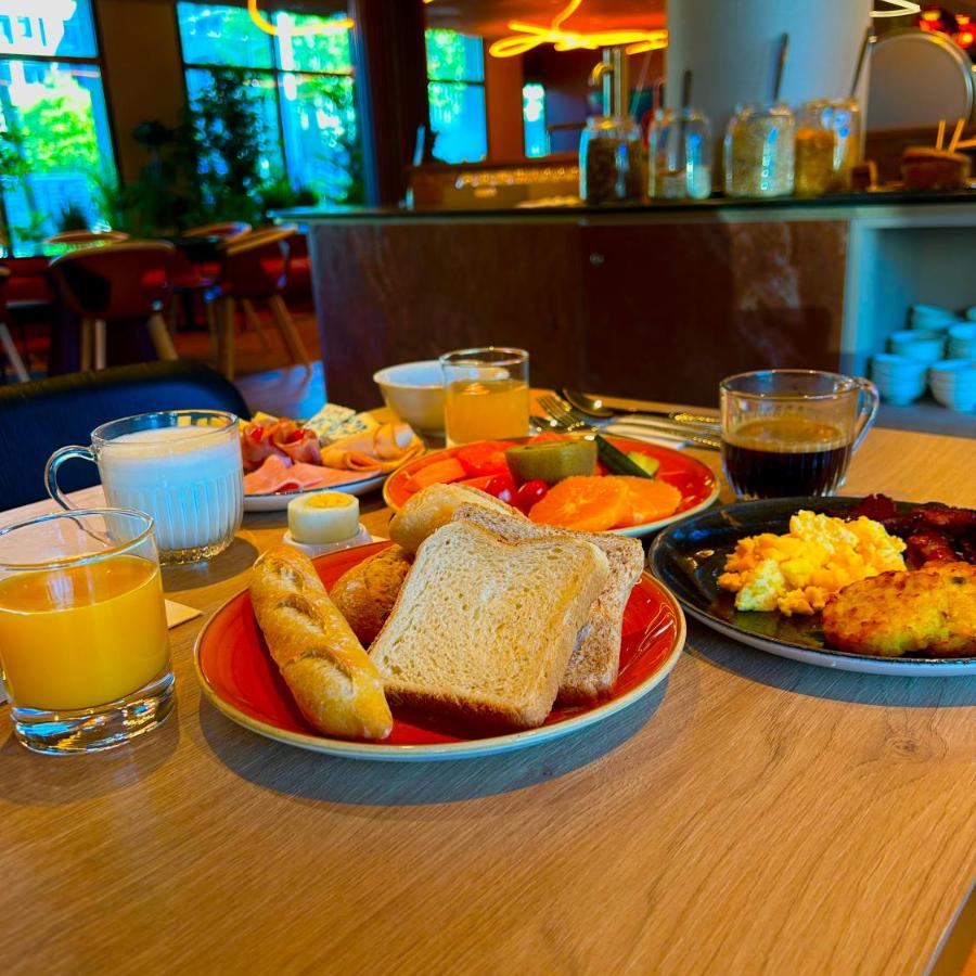Cada mañana, el bufé de desayuno combina embutidos regionales, panes crujientes y especialidades sin gluten; los niños menores de dieciséis años disfrutan del desayuno de forma gratuita si están acompañados por usted.